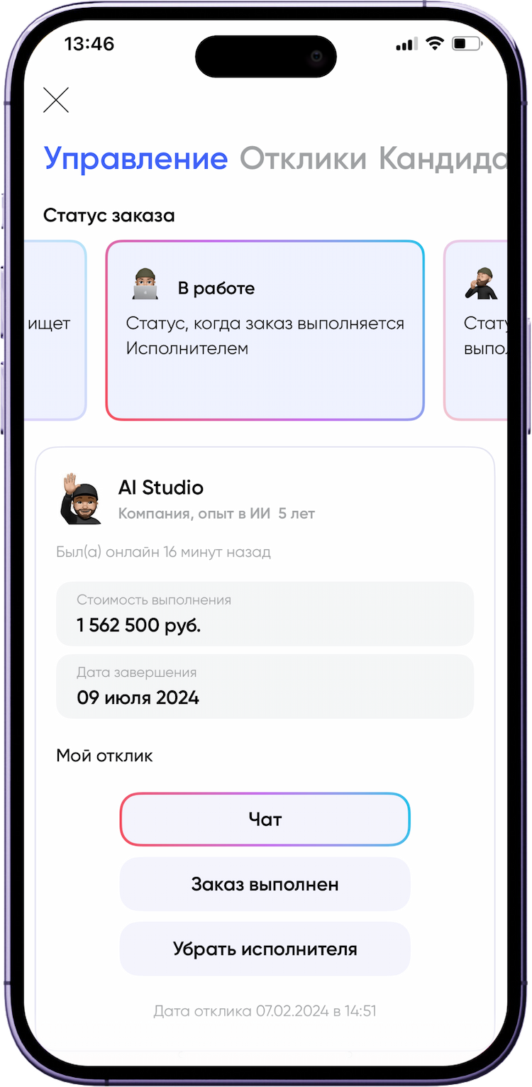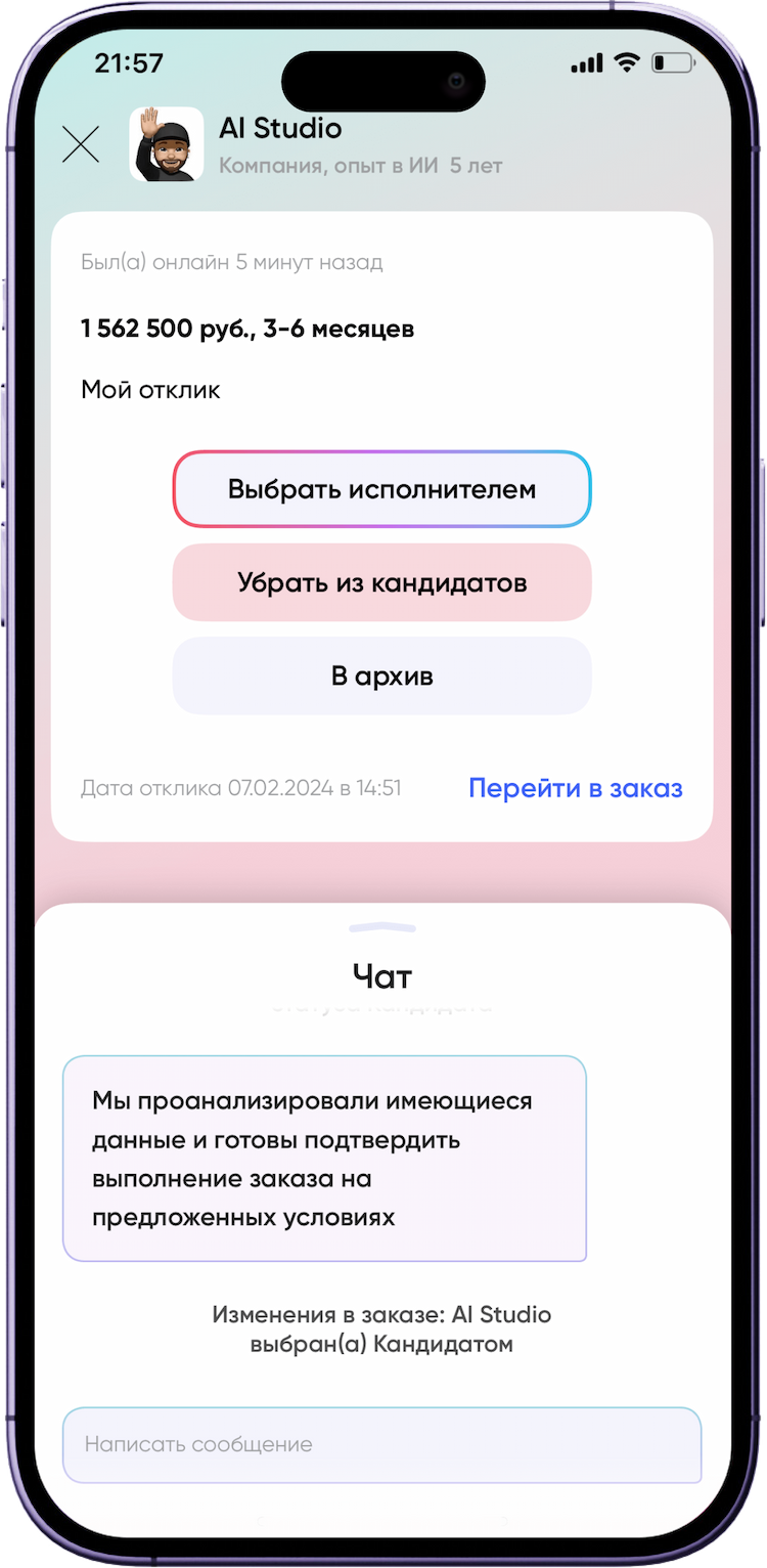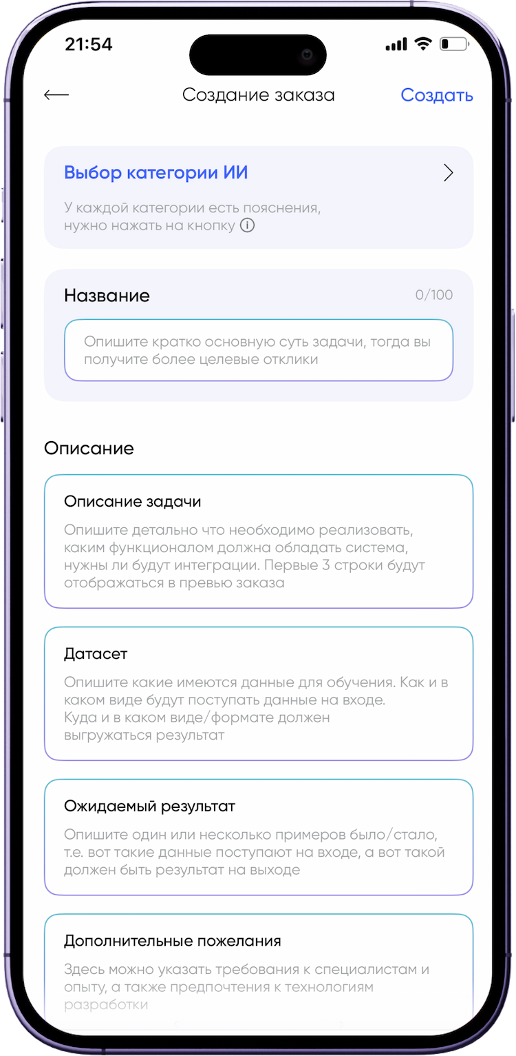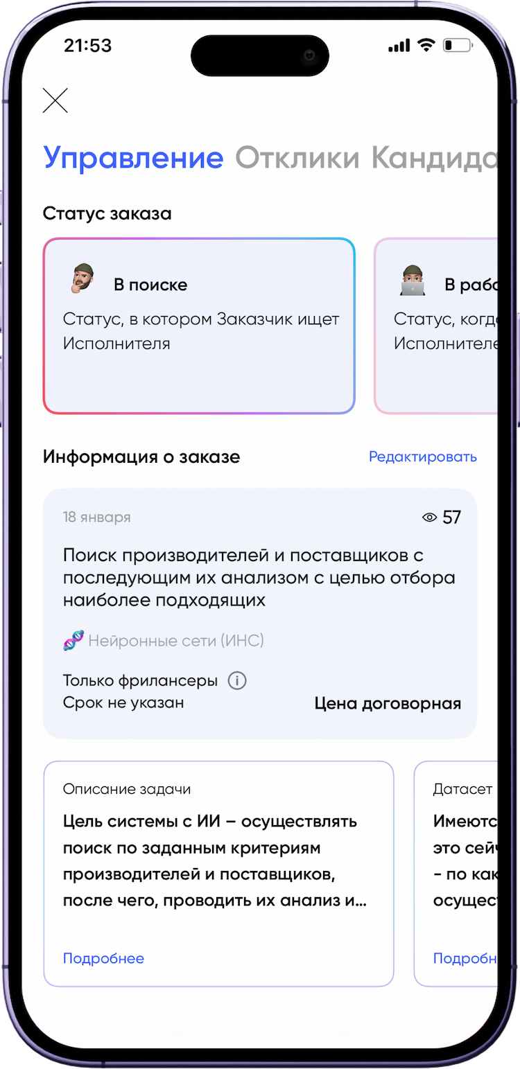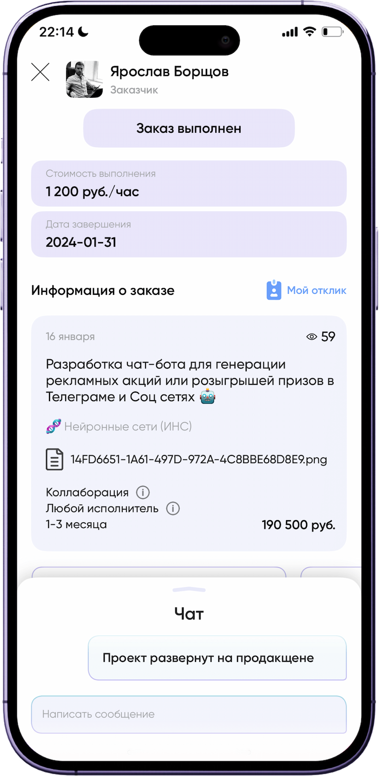 Бесплатная площадка по созданию ИИ, где Заказчики и Исполнители не только находят друг друга, но и осуществляют весь цикл разработки.