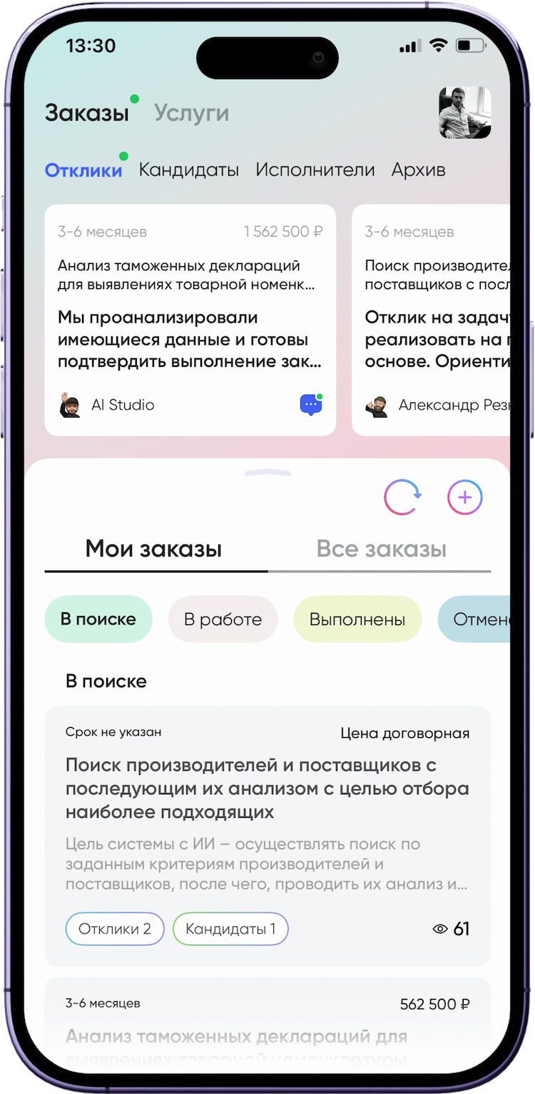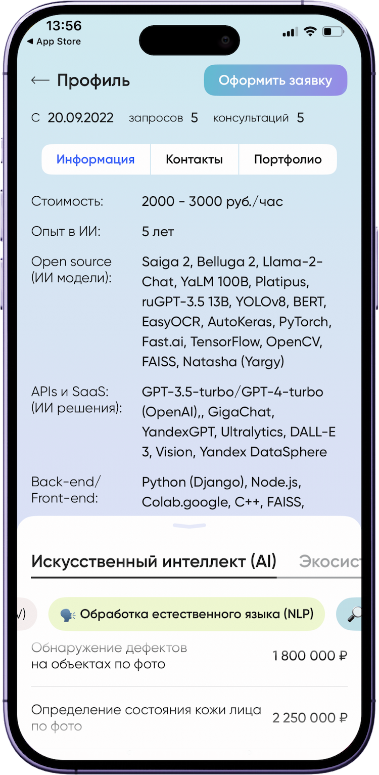 На площадке AI hub вы можете найти решение для любой задачи связанной с Искусственным Интеллектом, выбрав из готовых услуг или создав свой заказ.